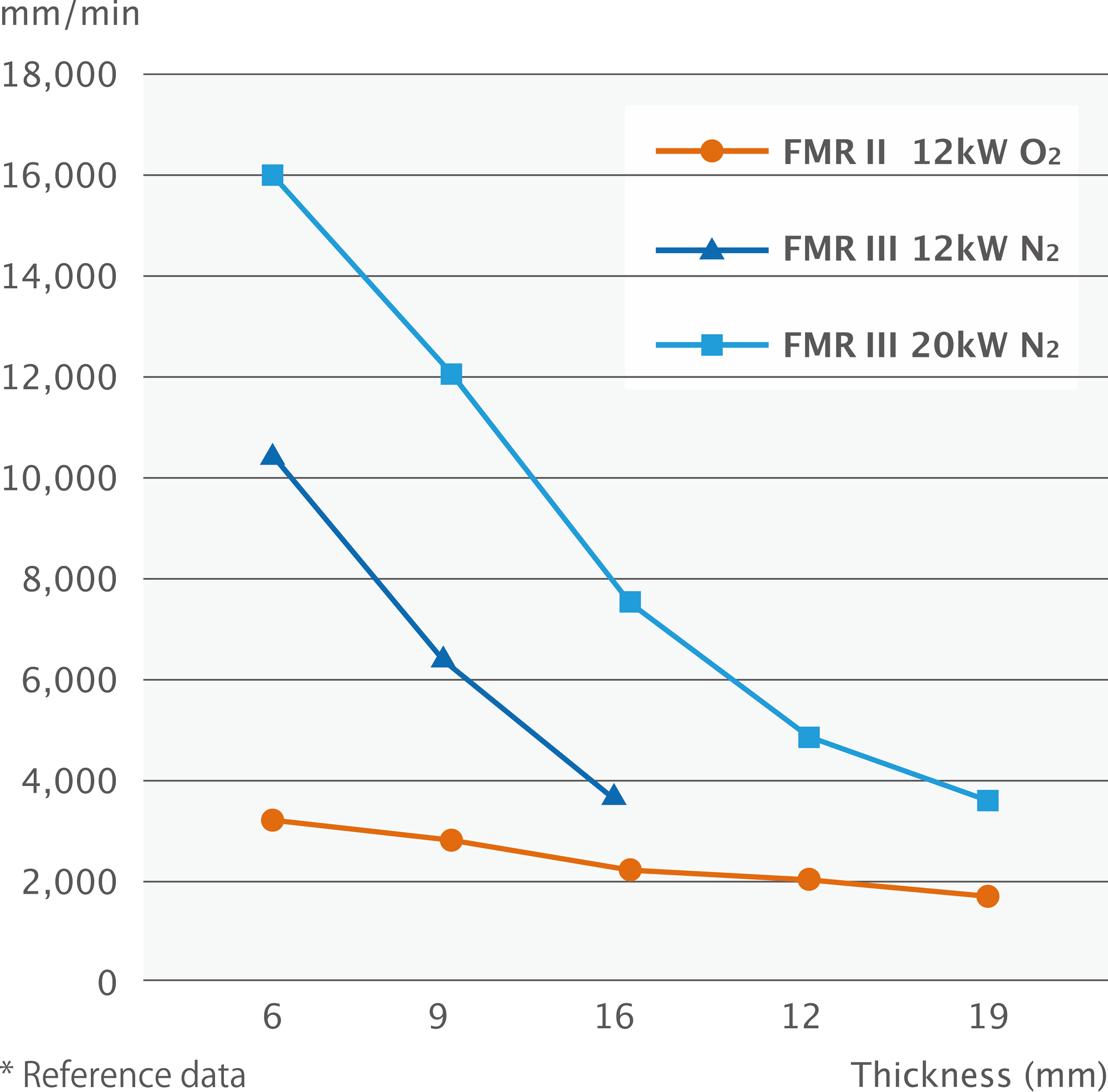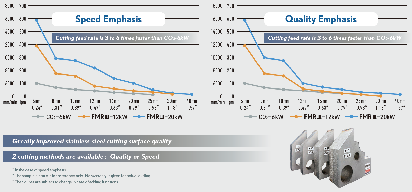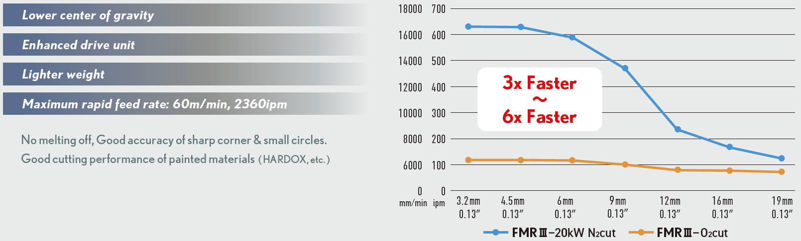 - Expanded maximum cutting thickness / FMRIII-20kW: Mild steel SS400 Max. t40mm (1.57")